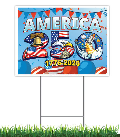 - Full-color, corrugated plastic yard signs celebrating 1776–2026