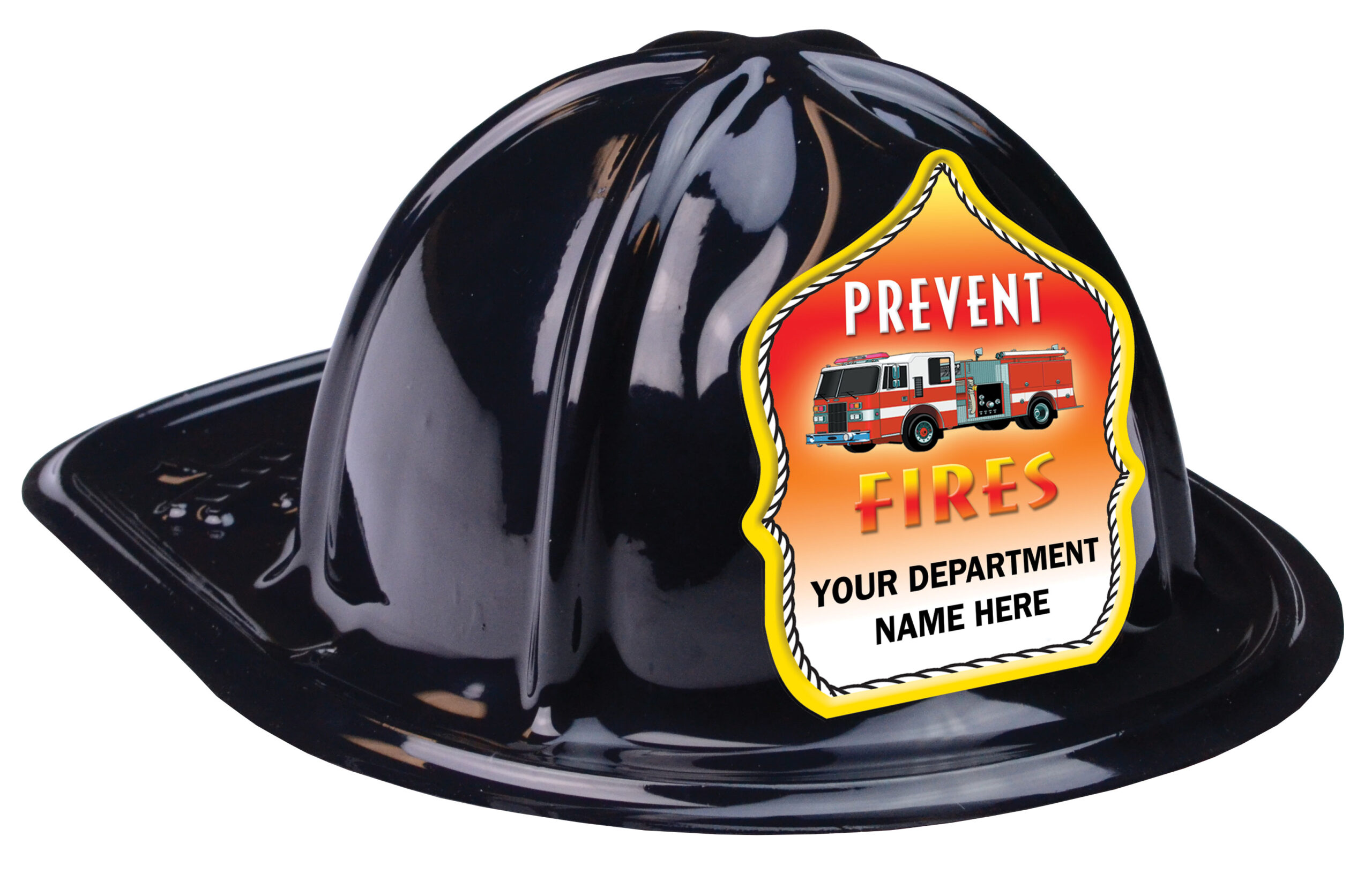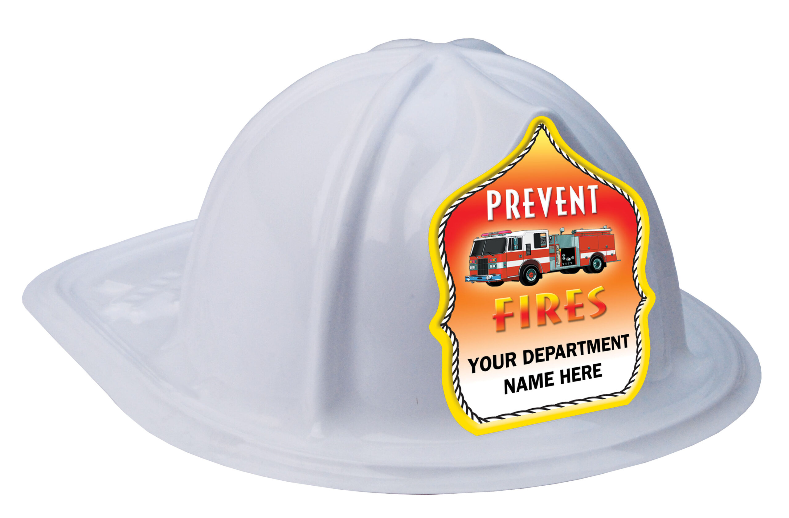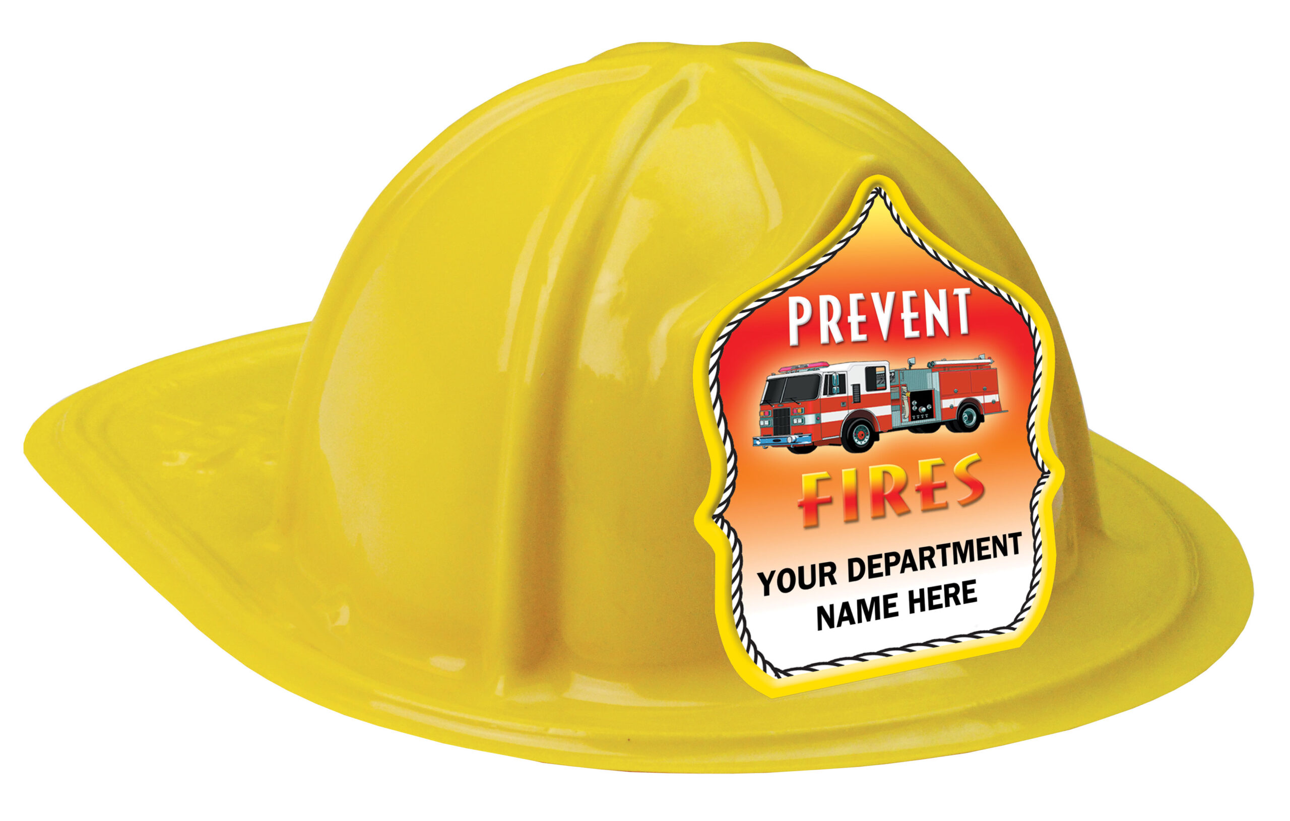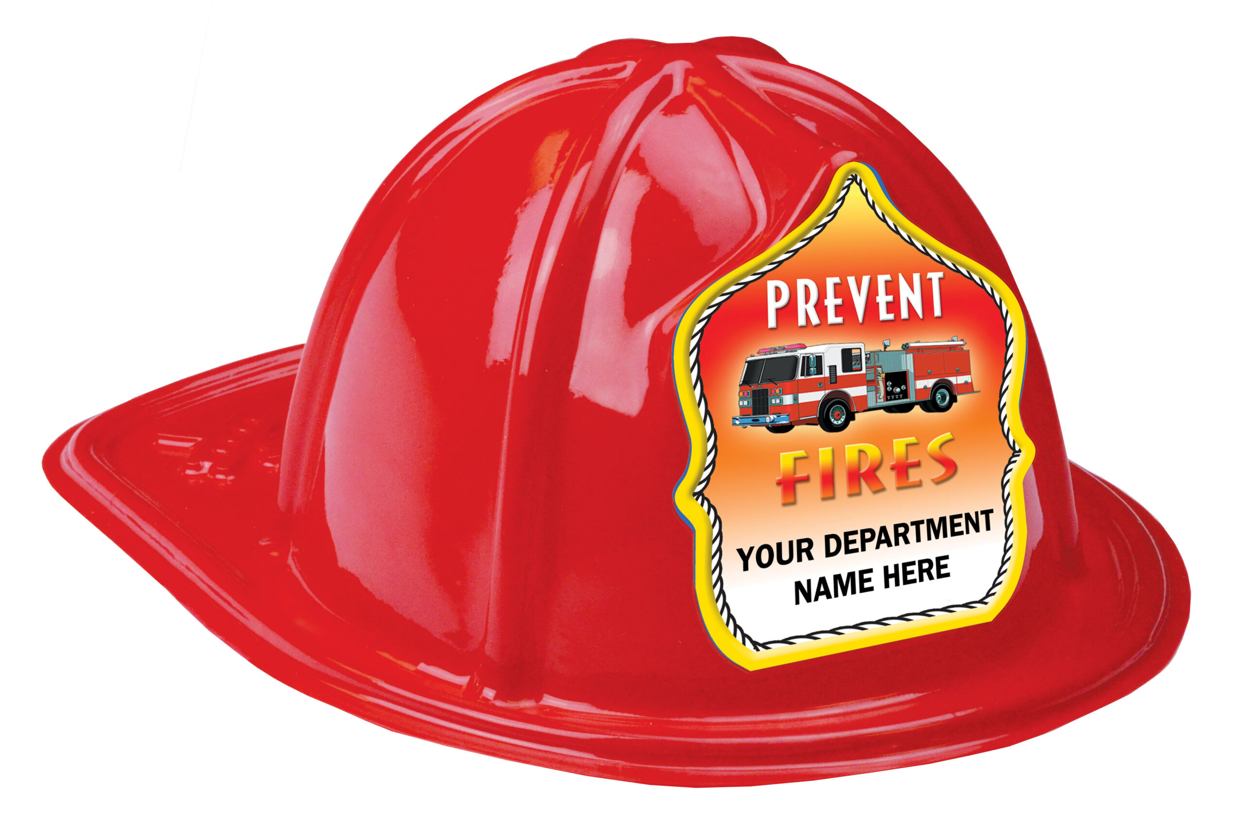 The plastic fire hat itself comes in multiple color options, while the custom Prevent Fires shield—complete with a fire truck graphic—does the talking. Adding your department name turns a friendly reminder into a lasting connection kids proudly take home.
